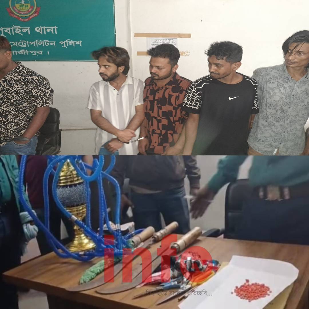 গাজীপুরের পূবাইলে টর্চার সেলে দেশীয় অস্ত্র,১৮০ পিছ ইয়াবাসহ ৯ মাদক কারবারি গ্রেপ্তার