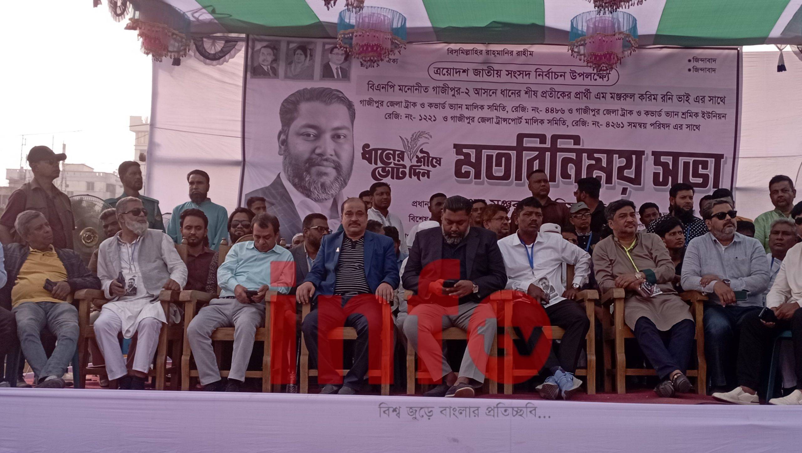 ত্রয়োদশ জাতীয় সংসদ নির্বাচনকে সামনে রেখে গাজীপুর-২ আসনে বিএনপি মনোনীত ধানের শীষ প্রতীকের প্রার্থী এম মঞ্জুরুল করিম রনির সঙ্গে গাজীপুর জেলা ট্রাক ও কাভার ভ্যান মালিক সমিতির এক মতবিনিময় সভা অনুষ্ঠিত হয়েছে।